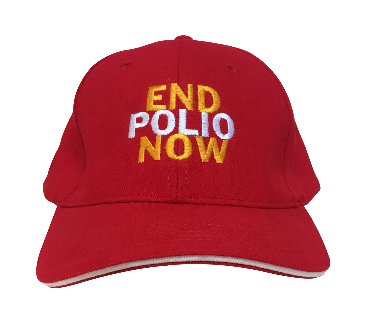 Classic full-depth red cotton cap with white old piping, embroidered with the End Polio Now branding.