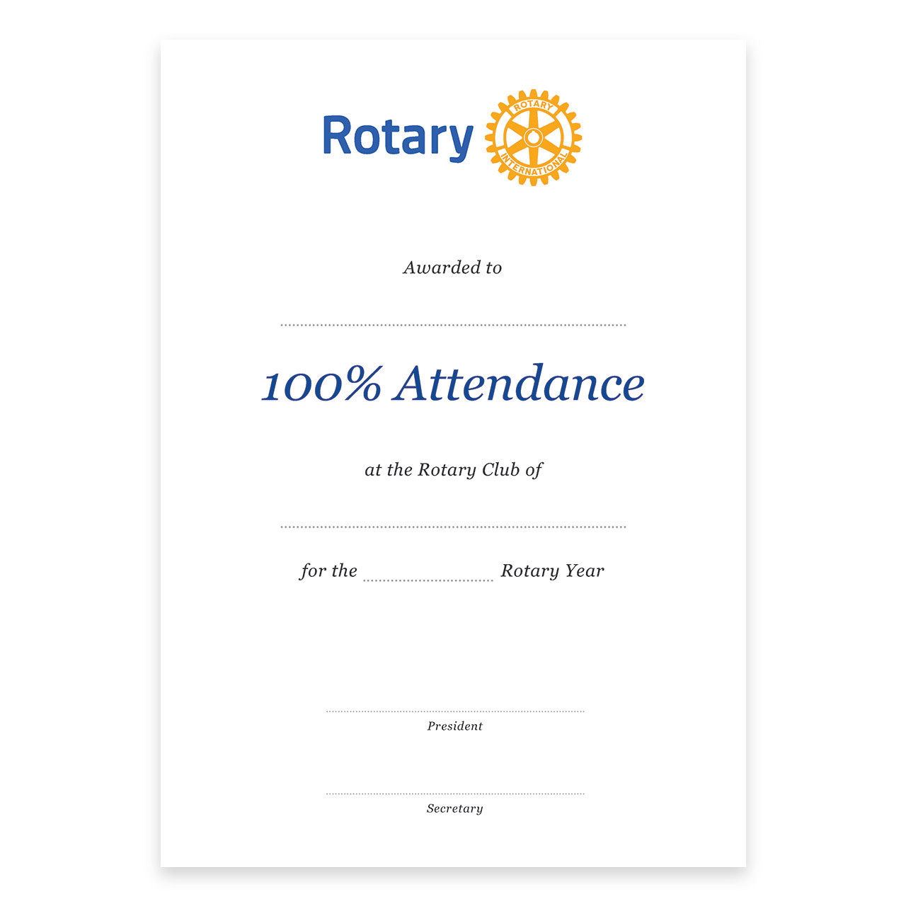 Reward the dedication of those who make the effort to attend every Rotary meeting with our 100% Attendance Certificate.