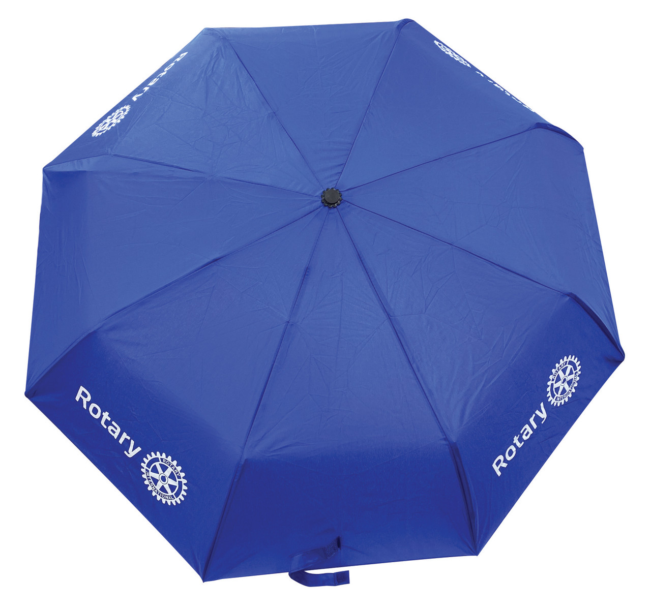 This royal blue umbrella features the Rotary Masterbrand logo in white on every other panel, blending convenience with Rotary pride.