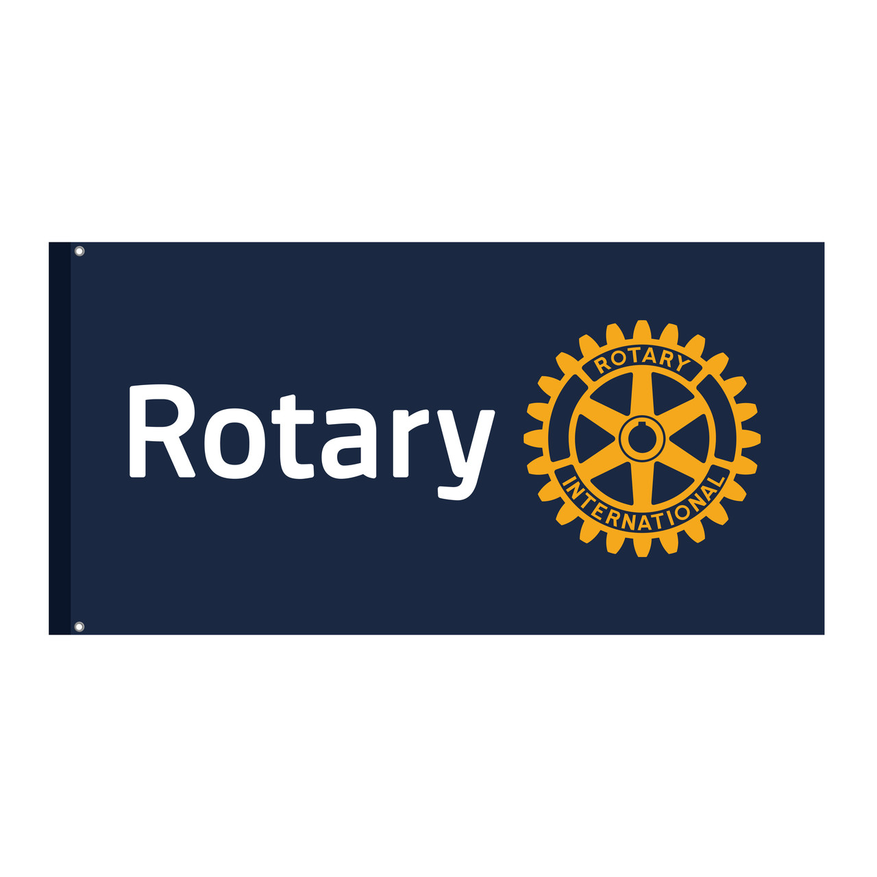 A blue flag with the Rotary masterbrand logo boldly printed on one side. The left hand edge has a long pocket and two eyelets for convenient display.